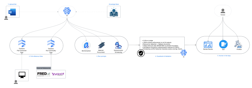 The five-step flow keeps humans in control throughout: upload bid, pull reference data from Firestore and live commodity feeds, run the three agents in sequence, pass every output through a guardrails layer (JSON schema enforcement, token limits, confidence scoring, conflict detection), then hand off to a human to review, edit, and finalize. Frontend and backend are containerized with Docker Compose. Sensitive data is processed in memory only with no persistent storage.